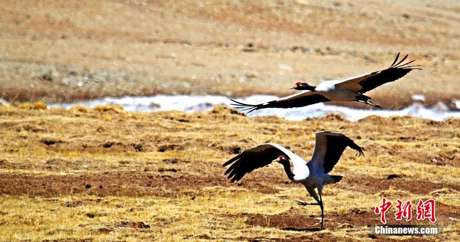 灰頸鶴在黃河源頭瑪多草原上嬉戲,敹嗫h委宣傳部供圖 -