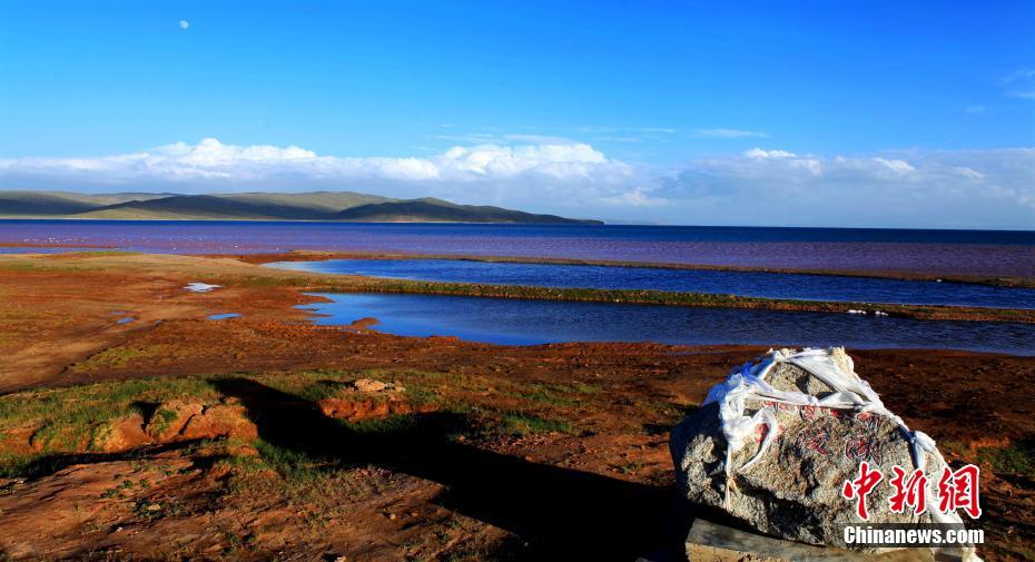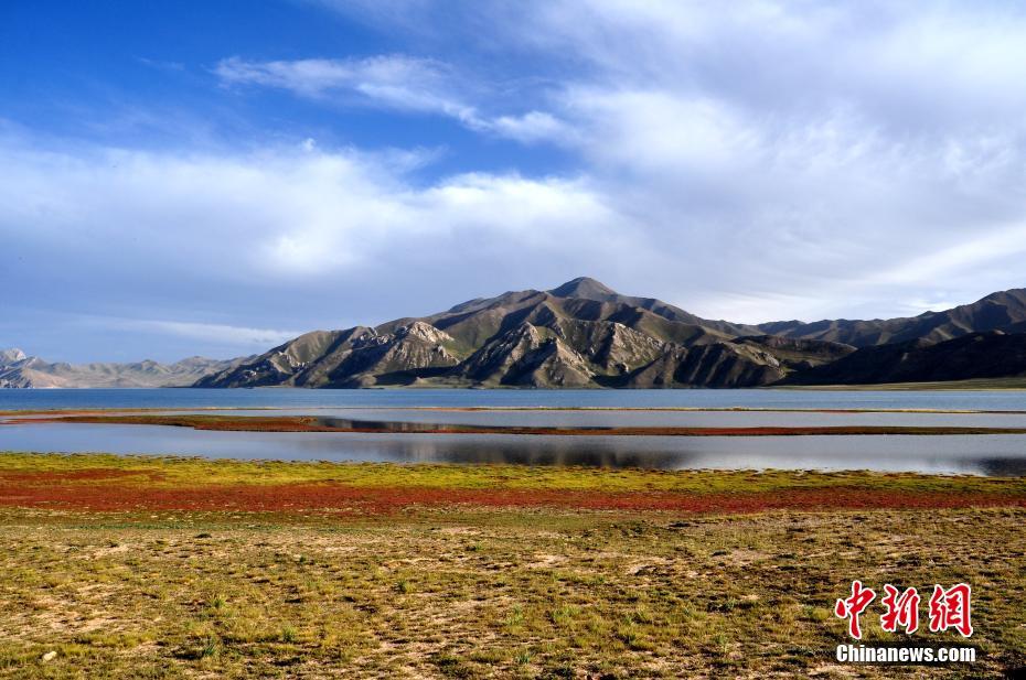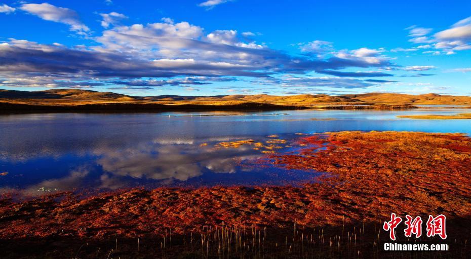 地處黃河源頭的冬格措納湖,湖水呈深藍(lán)色,是瑪多縣第三大淡水湖,被當(dāng)?shù)夭刈迦罕姺顬椤吧窈。金秋時(shí)節(jié),紅色的草灘與湖水相互映襯,仿佛油畫一般,敹嗫h委宣傳部供圖 -
