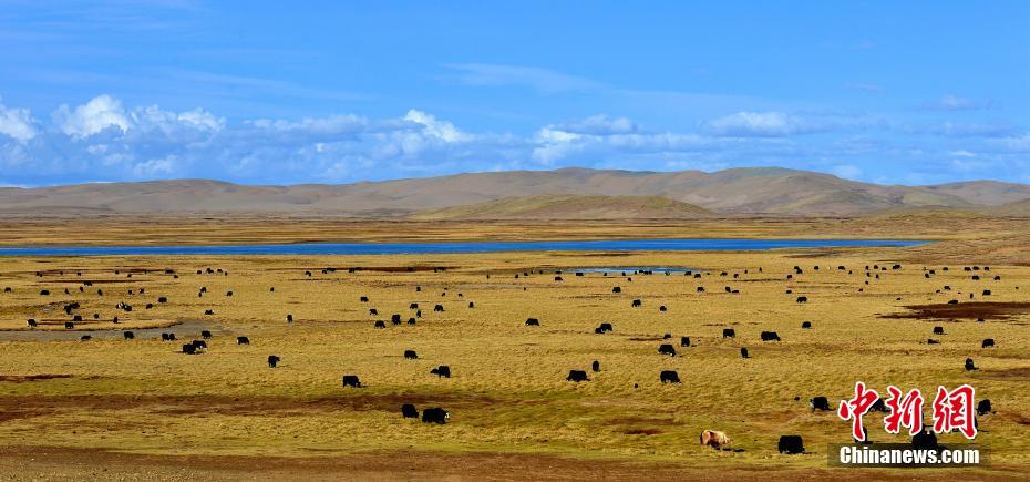 黑色的大牦牛在金黃色的瑪多草原上休憩食草。 瑪多縣委宣傳部供圖 -