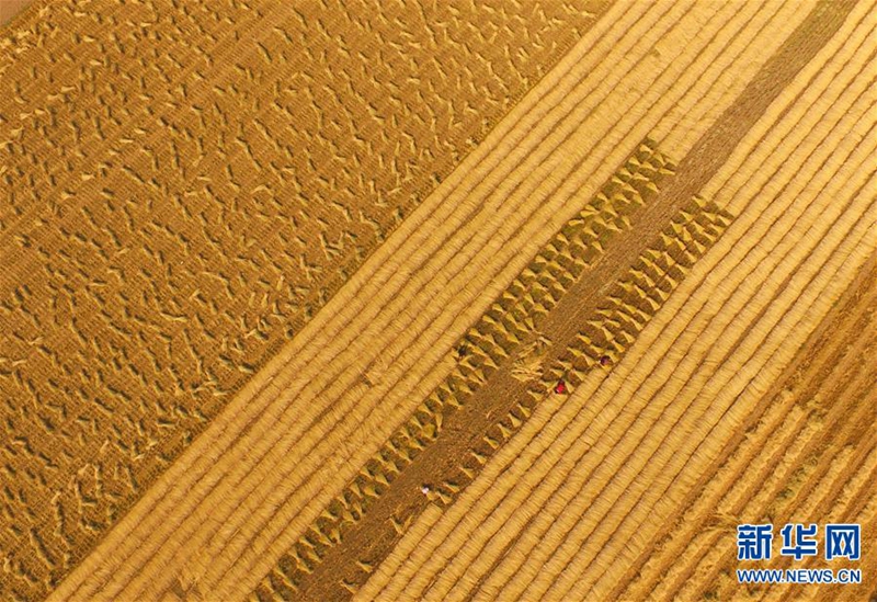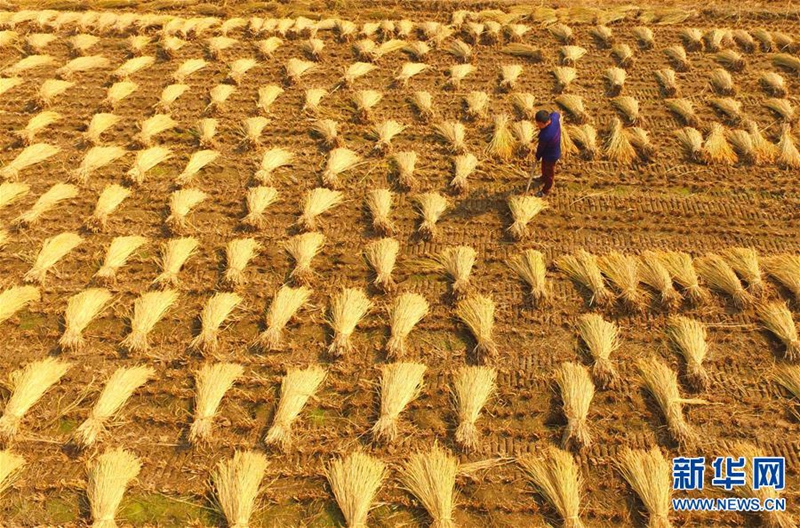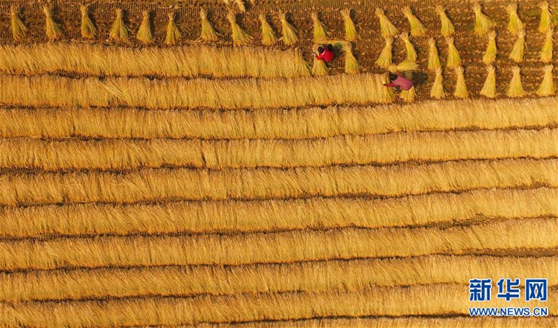 這是在原陽縣原武鎮(zhèn)拍攝的秋收場景(10月27日攝)。近日,河南省結(jié)束連續(xù)陰雨天氣,原陽縣境內(nèi)的水稻產(chǎn)區(qū)開始了緊張的搶收工作。農(nóng)戶們趁著有利天氣,紛紛加緊收割。新華社記者 馮大鵬 攝 -