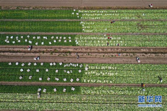 5月4日,農(nóng)民在江蘇省高郵市臨澤鎮(zhèn)營北村蔬菜基地采收娃娃菜(無人機(jī)拍攝)。 立夏節(jié)氣將至,各地農(nóng)民搶抓農(nóng)時(shí),田間地頭隨處可見農(nóng)民們忙碌的身影。 新華社發(fā)(沈冬兵 攝) -