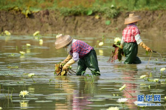 5月5日,海南省瓊海市嘉積鎮(zhèn)的農(nóng)民在田園里管理蓮花。 立夏節(jié)氣將至,各地農(nóng)民搶抓農(nóng)時(shí),田間地頭隨處可見農(nóng)民們忙碌的身影。 新華社發(fā)(蒙鐘德 攝) -