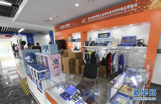 這是設(shè)在主媒體中心的官方特許商品零售店(10月14日攝)。 第七屆世界軍人運動會即將于10月18日正式開幕,目前,主媒體中心已經(jīng)運營,部分注冊媒體已經(jīng)陸續(xù)入駐,開始前期報道工作。 新華社記者 程敏 攝