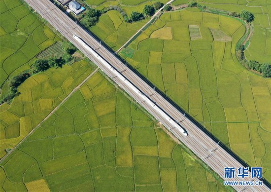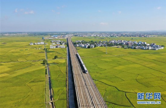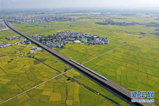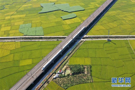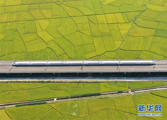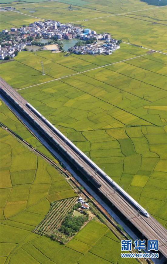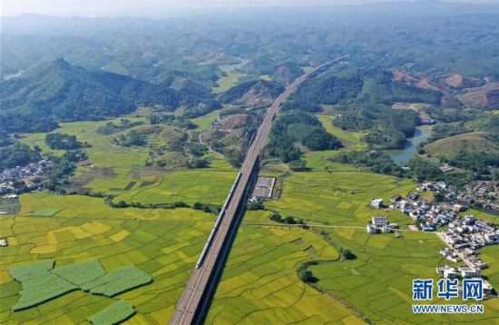 10月29日,列車從廣西賓陽縣古辣鎮(zhèn)豐收的稻田間駛過(無人機拍攝)。新華社記者 陸波岸 攝 -