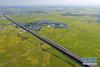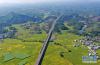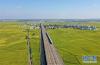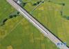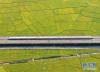 10月29日,列車從廣西賓陽縣古辣鎮(zhèn)豐收的稻田間駛過(無人機拍攝)。 新華社記者 陸波岸 攝 -