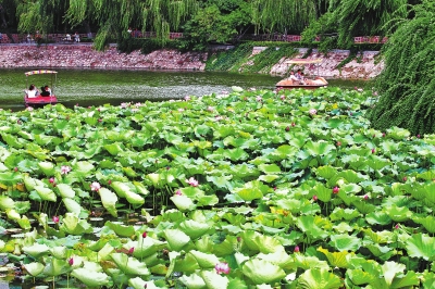 •   河南日報記者 鄧放 攝影報道   7月9日,游客在鄭州市紫荊山公園觀賞荷花。今年,該園有1萬多株荷花分四個展區(qū)供市民觀賞。