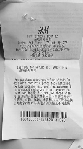 金山萬達廣場H&M商店在小票上注明特殊商品不能退換貨。