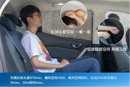身高180cm的人坐在車內(nèi),前排頭部空間依舊能夠超過10cm,達(dá)到一拳左右的距離,毫無壓迫感。而后排的腿部空間就更加突出,同樣測試人員調(diào)整好前排座椅坐姿移動到后排之后,腿部與前排座椅幾乎有三拳的距離,可以輕松來個“北京癱”或者翹個“二郎腿”了,而頭部空間也能夠達(dá)到一拳多一指的數(shù)據(jù)。