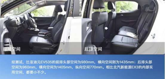 相比之下,比亞迪元EV535的車內(nèi)乘坐空間與后備箱空間就稍顯遜色了,甚至有不少消費(fèi)者已經(jīng)開始反饋后排乘坐空間偏小問題。受限于車輛軸距的長度,后排乘客的腿部空間會被迫犧牲一部分;橫向空間相比之下更窄的元EV535如果后排滿載的話,三位乘客的橫向空間更是令人無法接受。頭部空間的受到影響主要還是由于比亞迪元EV535底盤電池的原因,e平臺并沒有如EX3一樣全新設(shè)計(jì)整體的底盤結(jié)構(gòu)與電池位置。