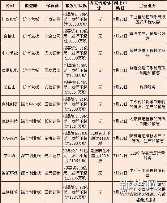 央廣網(wǎng)河南分網(wǎng)消息 據(jù)新華網(wǎng)報(bào)道:7月14日晚間證監(jiān)會(huì)官方微博發(fā)布消息稱,按法定程序核準(zhǔn)了12家企業(yè)的首發(fā)申請(qǐng),其中上交所6家,深交所中小板1家,深交所創(chuàng)業(yè)板5家。上述企業(yè)及其承銷商將分別與滬深交易所協(xié)商確定發(fā)行日程,今天起開始陸續(xù)招股,6家公司將于7月23日啟動(dòng)網(wǎng)上申購(gòu)。