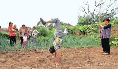 東北莊雜技最大的特色是“土”:“人土”,表演者清一色是農(nóng)民;“節(jié)目土”,一招一式、只言片語都是祖祖輩輩口授身傳傳承下來的。在東北莊,不管是田間地頭、房前屋后,都能看到村民們練雜技的身影。鐮刀鋤頭、桌椅板凳、草帽圍裙,乃至碗盤壇盆都是他們表演雜技的道具。
