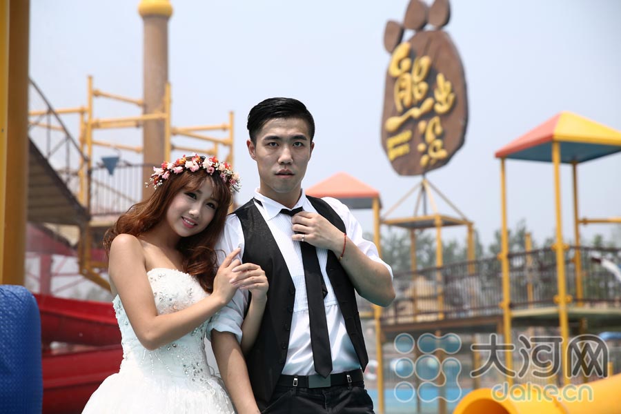 7月27日,河南省鄭州市,一對(duì)新人趕在七夕前夕拍婚紗照,考慮到鄭州連日高溫,就來到方特水上樂園拍攝親水婚紗照。新人亮相,引起游客尖叫圍觀,紛紛向其澆水祝福,更有游客現(xiàn)場(chǎng)“鬧洞房”搶走新娘。 (瀟光 文/圖)