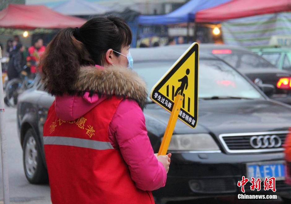 近日,在鄭州中方園雙語小學(xué)門前,每天上學(xué)和放學(xué)的時間,都會有身穿紅色馬甲手拿警示牌的家長出現(xiàn)在路口,示意車輛慢行,守護小學(xué)生安全過馬路。據(jù)學(xué)校德育處主任閆月平介紹,學(xué)校門前車流量大,特別是早上上學(xué)的時候,孩子們都是見縫插針在車流中穿行,經(jīng)?吹萌四憫(zhàn)心驚。于是,由學(xué)校家長委員會發(fā)起,自2014年12月4日開始,目前已經(jīng)有400多位家長參與“護路”工作,每天在孩子上學(xué)和放學(xué)的時間,會有12位家長分頭守在六個路口,手拿警示牌提醒過往車輛減速,引導(dǎo)孩子安全過馬路。湯荔 攝