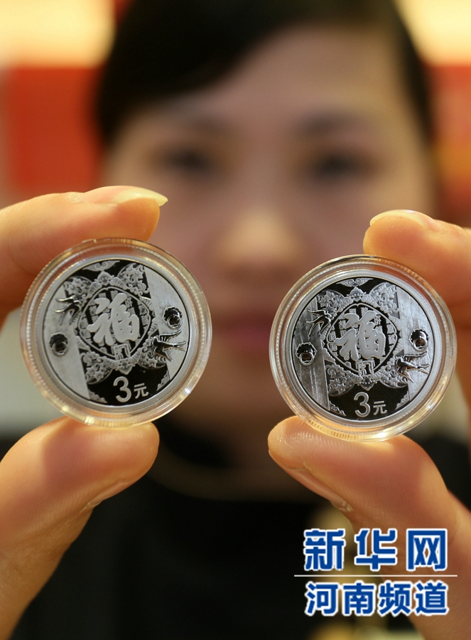 央廣網(wǎng)河南分網(wǎng)消息 3元賀歲銀幣于1月17日在河南錢幣有限公司首次亮相。據(jù)悉,2014年12月26日,中國人民銀行發(fā)行了2015年賀歲銀幣紀念幣一枚,這也是央行首次發(fā)行賀歲題材的貴金屬紀念幣。這枚被稱為“袖珍式”的紀念幣只有7.776克(1/4盎司),直徑25毫米,面額3元,最大發(fā)行量60萬枚。(盧鍵 攝)