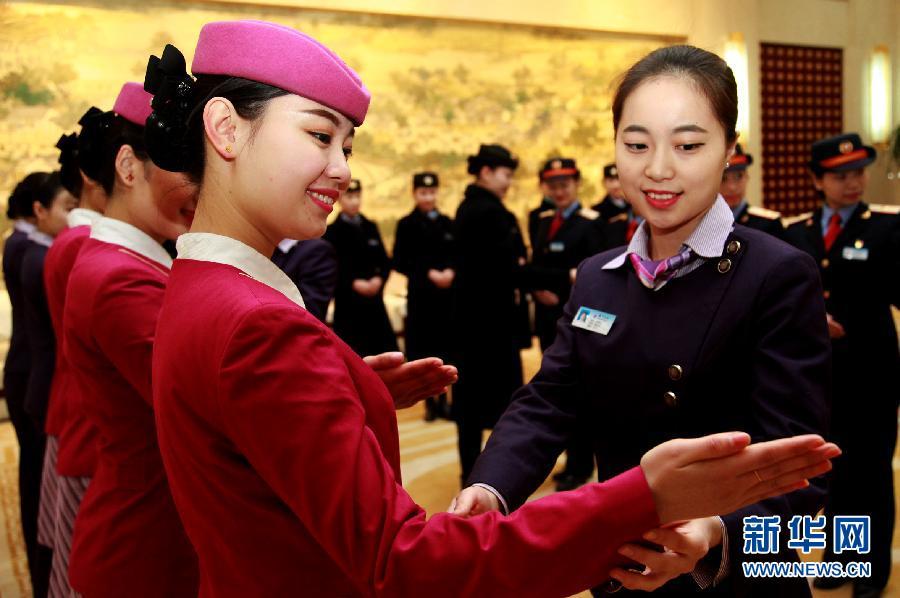 1月28日,鄭州東站和鄭州客運(yùn)段的職工在切磋服務(wù)技能。當(dāng)日,鄭州東站和鄭州客運(yùn)段組織職工召開“站車一家親,攜手戰(zhàn)春運(yùn)”動(dòng)員大會(huì),通過(guò)模擬演練應(yīng)對(duì)大客流、服務(wù)殘疾人旅客、列車緊急救援等,號(hào)召職工們認(rèn)真做好春運(yùn)各項(xiàng)準(zhǔn)備工作,確保春運(yùn)安全。新華社記者 李安 攝 圖片來(lái)源:新華網(wǎng)