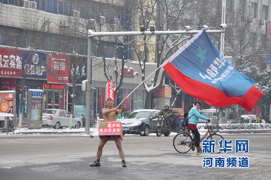1月29日,駐馬店一男子赤裸上身,下身僅穿一短褲,揮舞著旗幟沿解放大道向西跑,引來眾多市民圍觀、拍照。