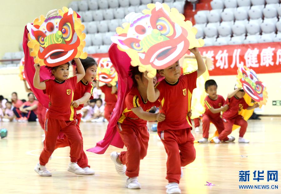 •    5月26日,老師和孩子正在進行舞龍表演。 當日,在開封市紅旗幼兒園舉辦民間體育游戲展示暨大班畢業(yè)典禮上,老師和孩子們一起跳竹桿、抖空竹、舞獅子、賽龍舟,快快樂樂地迎接“六一”國際兒童節(jié)的到來。 新華網發(fā)(李俊生 攝 )