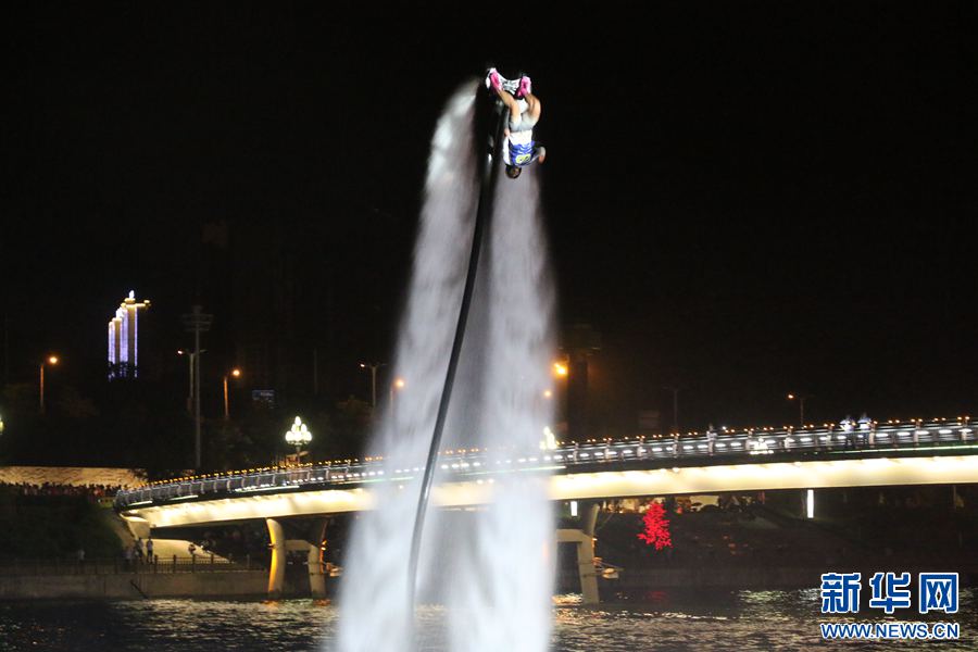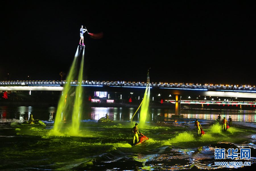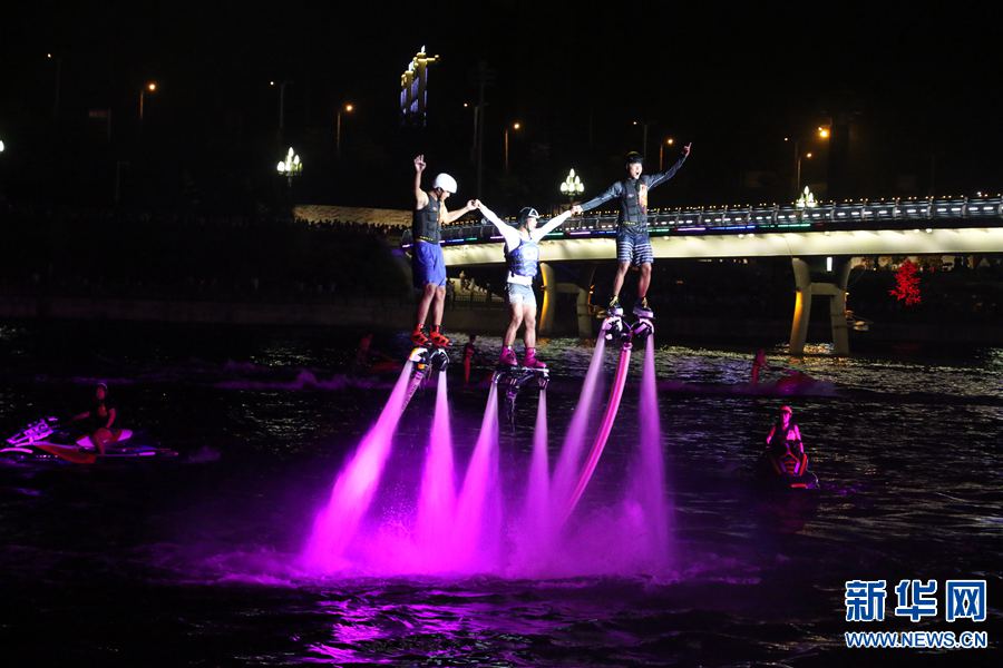 2017年5月26日晚,三門峽第二屆水上嘉年華表演在文博城青龍澗河水域激情上演。此次水上嘉年華活動,邀請國內(nèi)頂級的3支水上飛龍及6艘摩托艇組成花式表演團,借助文博城水上舞臺的燈光、音響、噴泉等元素,為廣大游客和市民帶來了“長龍出游”“排山倒!薄鞍倩R放”“鯉魚跳龍門”“空中漫步”等驚險刺激而又極富觀賞性的節(jié)目。當晚,在文博城青龍澗河水域,表演者空翻、俯沖、鉆水……一幕幕驚險刺激的動作場面,讓觀眾感受到了一場速度與激情同在、力量與炫酷并行的視覺盛宴,贏得觀眾聲聲喝彩、陣陣掌聲。新華網(wǎng)發(fā)(鞏衛(wèi)東 攝) -