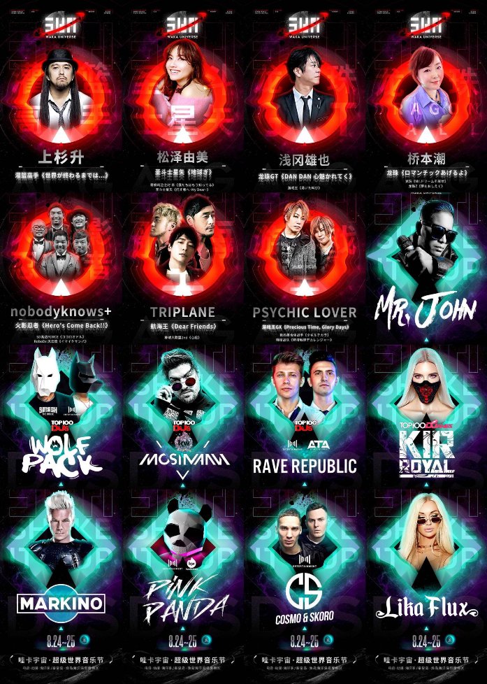 SWM·哇卡宇宙超級世界音樂節(jié)——電音·動漫·海洋季,三大主題娛樂元素精心策劃,傾力巨制,造就2019超燃的海洋狂歡Party,而來自多國的九組DJ及七組ACG動漫原唱樂隊,共16組藝人帶來的豪華陣容無疑會成為本次音樂節(jié)現(xiàn)場的一大燃點。