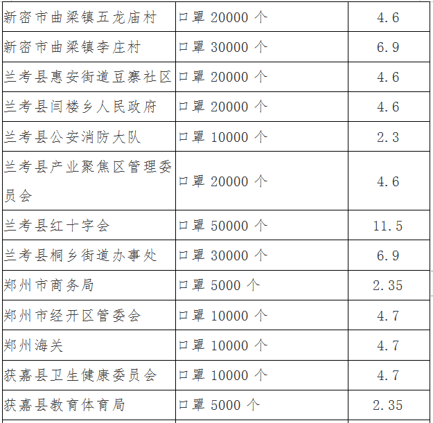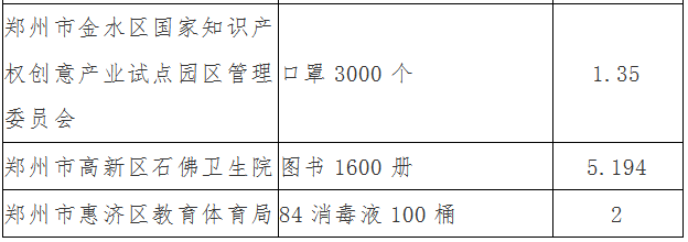根據(jù)《慈善法》及相關(guān)法規(guī)規(guī)定,按照捐贈(zèng)單位和個(gè)人意向,結(jié)合鄭州市防控疫情相關(guān)單位提供的信息,鄭州慈善總會(huì)已向社會(huì)發(fā)布7個(gè)公告,使用善款5471.708154萬元,物資價(jià)值1564.048518萬元。現(xiàn)將鄭州慈善總會(huì)使用社會(huì)捐贈(zèng)款第八批102.220301萬元、物資價(jià)值649.743053萬元情況,即第8號(hào)公告如下。