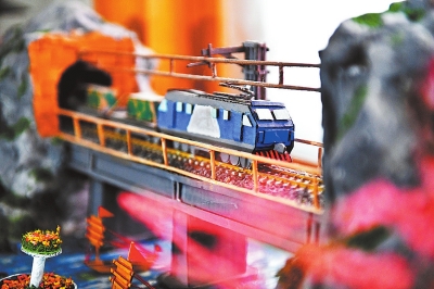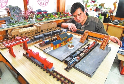 站臺、站房、天橋、鐵軌、蒸汽機(jī)車、電力機(jī)車、貨運(yùn)列車、龍門吊……11月24日,走進(jìn)洛陽車站貨運(yùn)員孫玉明的家中,一件件逼真的鐵路模型擺在桌子和窗臺上,讓人仿佛進(jìn)入了“鐵路王國”。為了給新學(xué)員做業(yè)務(wù)培訓(xùn),他用廢紙箱板、泡沫板、掉落的樹枝等材料,按比例做成模型給學(xué)員講解。8年以來,他已制作出百余件鐵路模型。