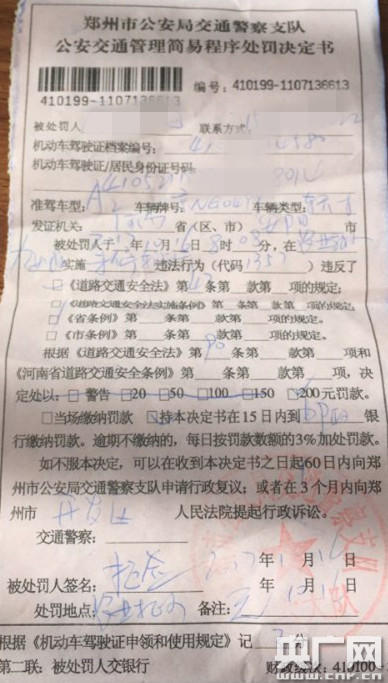 鄭州交警六大隊民警崔警官告訴記者,民警現(xiàn)場執(zhí)法開具罰單,必須在交通警察一欄中簽字或者蓋章,如果沒有民警簽章,說明他執(zhí)法程序不完全,不規(guī)范。