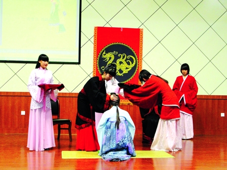 4月12日晚,信陽師院舉辦了“華夏有衣,襟帶天地”漢服交流推廣活動,雙蝶羅裙、碧色曲裾、淺藍儒袍、玄黑錦衣等一件件別具特色的服飾仿佛帶著同學們坐上了時光機,穿越到漢朝去領(lǐng)略漢服千年的璀璨文明。迎賓、就位、開禮、笄者就位、賓盥、初加、一拜、二加……笄禮(女子成年禮)表演,讓在場的觀眾很是震撼,華麗、優(yōu)雅、博大的氣質(zhì)漢服時裝秀也成了一幅別樣校園亮麗風景畫。 (丁少鋒 劉泉池 )