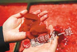 在沙坪壩一農(nóng)貿(mào)市場(chǎng)上專門賣血旺的攤販陳某稱,他每天要從鄭禮橋那里進(jìn)4到5桶的血旺,總量在300斤左右。
