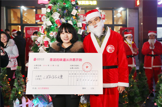 活動現(xiàn)場,飲品店為一位女學(xué)生實現(xiàn)了愿望。據(jù)該女生介紹,她買了杯6元的奶茶,只是抱著嘗試的心態(tài)寫下了自己的愿望:留在這個城市,是我目前最大的夢想。但追夢路上,心底最大的牽絆卻是逐年老去的父母和再也回不去的老家。如果真的有圣誕老人,只希望他能幫我把家里的老房子修一修,讓爸媽在寒冷的冬日有暖暖的幸福,讓自己追夢路上少些后顧之憂。