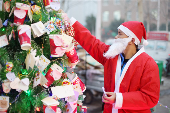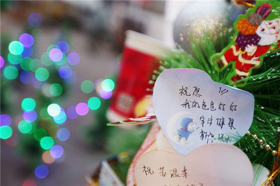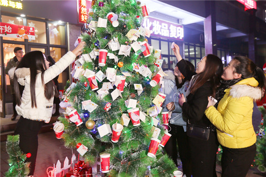 飲品店門口,現(xiàn)場的大學(xué)生紛紛把自己的愿望寫在卡片上,而后掛在圣誕樹曬出來:希望不掛科、想找到個全能男朋友等愿望引得眾人紛紛拍照。