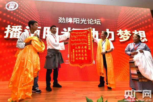 圖為勁牌西藏陽光班代表向勁牌公司董事長吳少勛敬獻哈達
