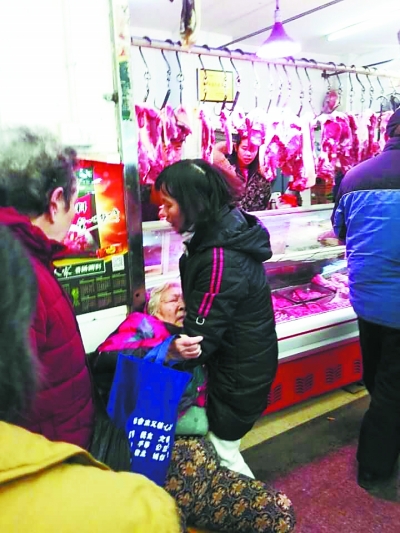 倒在女子懷里后,婆婆一直呻吟著,沒有睜開眼睛。在眾人幫助下,女子將婆婆扶到肉攤旁靠墻的板凳上坐下。墻壁冰涼,女子不敢讓婆婆直接靠到墻上,便用自己的身體擋住墻,讓婆婆靠在自己身上。就這樣,女子一直保持著半蹲的姿勢,抱著婆婆。