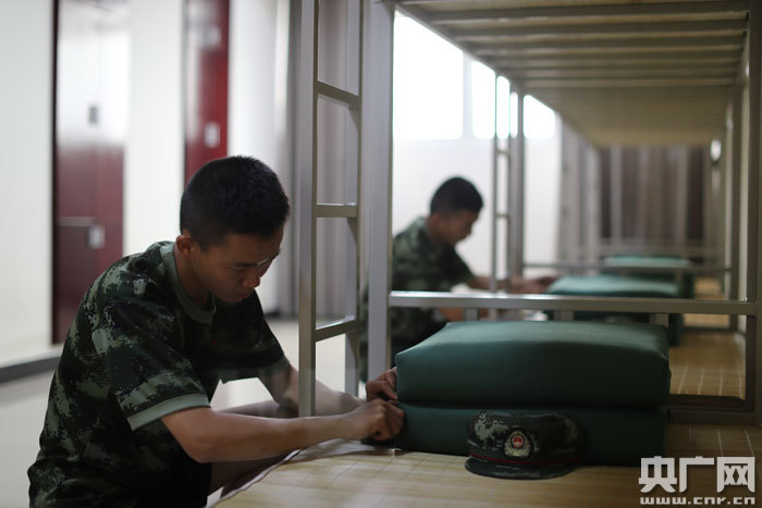 圖為政府專職消防員整理寢室內(nèi)務(wù)