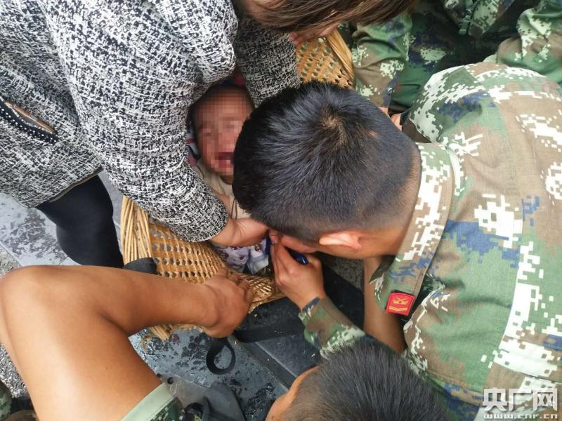 中隊官兵了解情況后,一邊讓小孩子奶奶安撫小孩,一邊利用鉗子、剪刀等工具迅速從背簍的上半部分開始剪開。五分鐘后,小孩被成功救出。