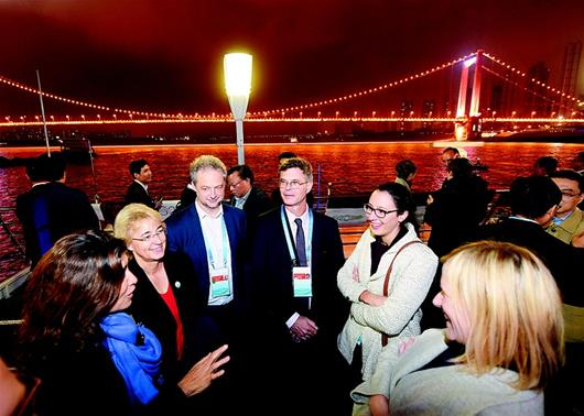 圖為:昨晚,參會代表在游船上邊欣賞美麗的武漢夜景邊聊天。