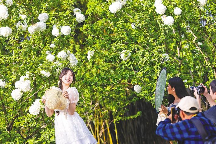 4月4日,武漢沙湖公園內(nèi)繡球花競相綻放,潔白花團綴滿枝頭,市民游客踏青賞花,拍照打卡,感受春日美好,樂享春假愜意時光。