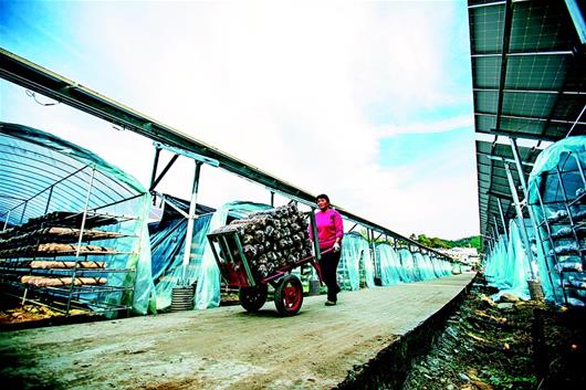 10月18日,竹山縣溢水鎮(zhèn)東川村村民在運(yùn)送食用菌棒。東川村農(nóng)光互補(bǔ)基地占地158畝,按照“農(nóng)光互補(bǔ)”的模式,在光伏電站下面同步建設(shè)食用菌出菇棚,光伏電站已于今年4月并網(wǎng)發(fā)電。目前菌棒生產(chǎn)已突破150萬(wàn)袋,可實(shí)現(xiàn)年產(chǎn)值1500萬(wàn)元。同時(shí),該鎮(zhèn)引進(jìn)綠谷食用菌公司作為市場(chǎng)主體,與52戶貧困戶簽訂食用菌種植協(xié)議,人均年增收2萬(wàn)元以上。 (視界網(wǎng) 章磊 攝)
