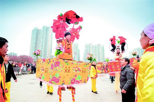 2月17日,小朋友在高空不停翻轉(zhuǎn)表演高蹺亭子。高蹺亭子是武漢市新洲區(qū)孔埠街堤圍村傳統(tǒng)技藝,迄今已有400多年歷史,被武漢市最早列入“非遺”項目。當天是農(nóng)歷正月十三,新洲區(qū)30多個非遺項目在邾城人民廣場集中展演展示鬧新春,吸引數(shù)千市民駐足觀賞。