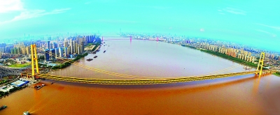 楊泗港長江大橋呈現(xiàn)金秋黃色調