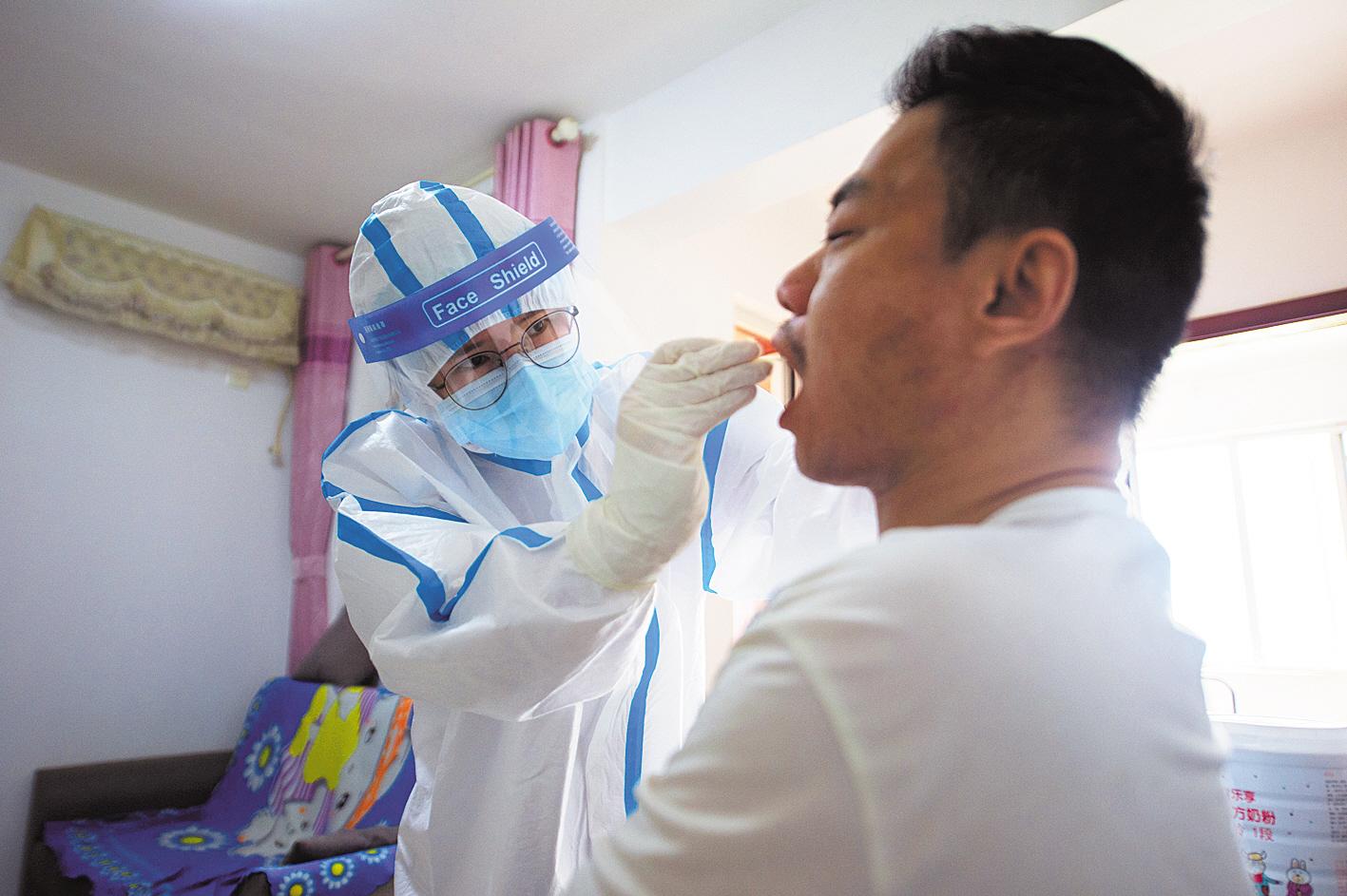 5月21日,武漢市硚口區(qū)張公堤北社區(qū),武漢市第一醫(yī)院兒科護士秦玲上門為行動不便的居民進行咽拭子取樣。從5月12日開始,武漢市第一醫(yī)院60余名醫(yī)護人員先后在竹葉海、張公堤北等7個社區(qū)搭臺設(shè)點,為近3萬名居民進行新冠病毒核酸和抗體檢測采樣。(湖北日報全媒記者 蔡俊 攝)