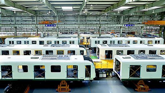 湖北日報(bào)訊 圖為:昨日,在總裝生產(chǎn)車間內(nèi)地鐵列車正在組裝中。當(dāng)日,在武漢市黃陂區(qū)中車武漢長客公司,首列“武漢造”時(shí)速100公里A型地鐵車輛下線試跑。