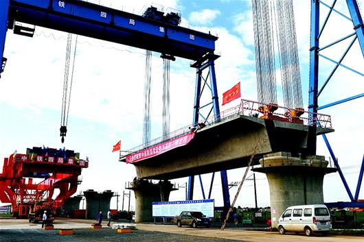 湖北日報訊 昨日上午,鄭(州)萬(州)高鐵湖北段首片箱梁在襄陽市襄州區(qū)白河特大橋成功架設(shè),鄭萬高鐵湖北段架梁施工全面展開。新建鄭州至萬州鐵路客運專線為鄭渝高鐵(鄭州—重慶)的重要組成部分,由鄭州高鐵南站引出,終點至重慶萬州,全長818公里,設(shè)計時速為350公里,預(yù)計2022年全線建成通車,其中鄭州至襄陽段預(yù)計2019年底建成通車。鄭萬高鐵湖北段由河南鄧州進入我省襄陽市,經(jīng)南漳、?怠⑸褶r(nóng)架、興山、巴東進入重慶市境內(nèi),全長287公里。(記者 周立新 夏永輝 攝)