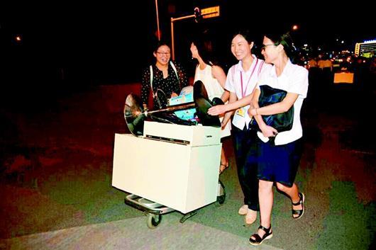 圖為:機(jī)場工作人員夜色中搬家