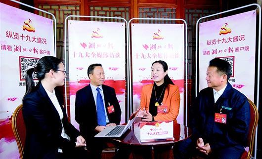 圖為:劉雪榮代表(左二)、楊小玲代表(右二)、戴益朋代表(右一)參加湖北日報十九大全媒體訪談。(記者柯皓 攝)