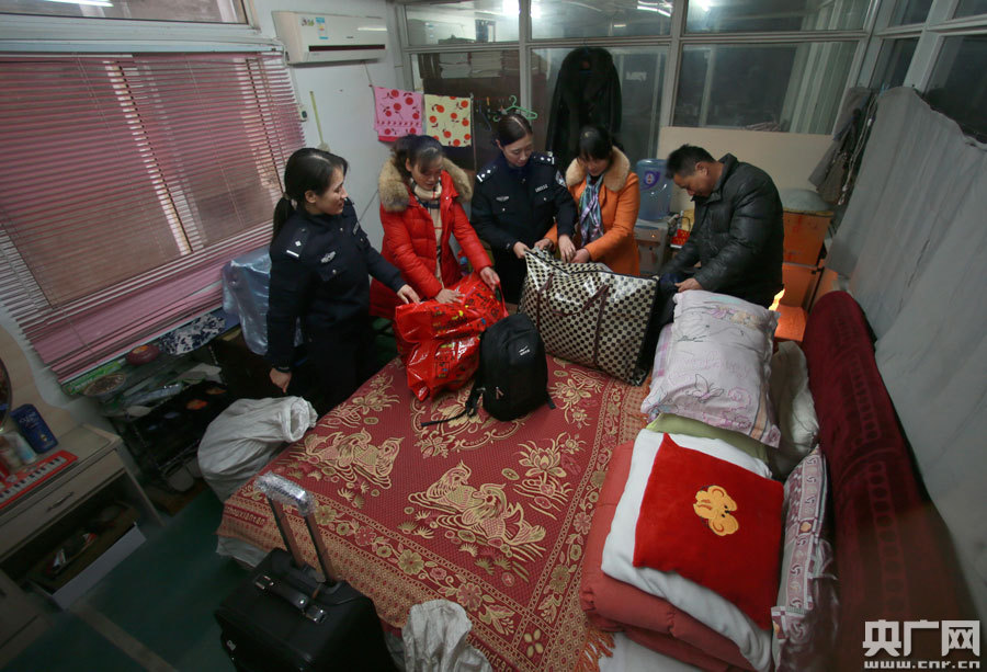 央廣網武漢1月22日消息(記者熊峰 通訊員趙軍 嚴潔)1月22日,湖北武漢,在武漢市江岸區(qū)金虎針織服裝廠務工十幾年的蔡紅,是重慶市江津區(qū)油溪鎮(zhèn)9組村民,她已經買好了22日D2242次返鄉(xiāng)的火車票。今天一大早,蔡紅就張羅著整理回家的行李物品,但由于行李太多,她不得不求助服裝廠對面的武鐵江岸西站派出所鐵警和街坊幫忙。鐵警默武紅、懷麗和街坊鄰居二話沒話都伸出手,很快幫忙整理好蔡紅要攜帶行李。江岸西站派出所還特事特辦,開車送蔡紅到武漢火車站,解決了蔡紅返鄉(xiāng)行李多難搬運的煩惱。圖為:鐵警楊洋〔左一〕、懷麗〔左三〕等街坊幫川嫂蔡紅〔左二〕清點好行李。 -