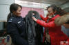 川嫂蔡紅〔右〕給鐵警懷麗〔左〕展示回鄉(xiāng)過年的新皮衣。 -
