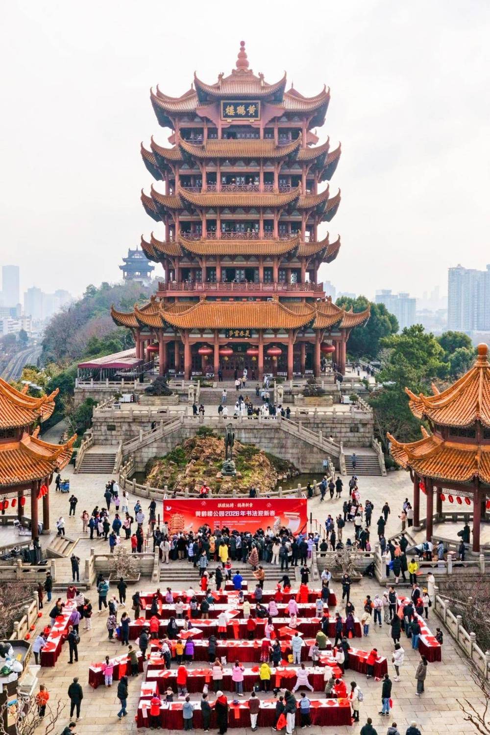 今年的主會場布置別具巧思。近百張書法桌在黃鶴樓主樓前廣場上排列成一個氣勢恢宏的“春”字造型,從高處俯瞰顯得格外壯觀。這一匠心設計不僅營造出濃厚的節(jié)日氛圍,更蘊含著“江城春早”“文化長春”“家國同春”三種美好寓意,寄托了對城市發(fā)展、文化傳承和國家繁榮的誠摯祝愿。