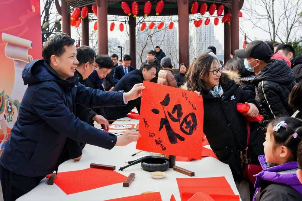 與往年相比,今年活動在規(guī)模與形式上再度升級,歷時兩天(2月6日至7日),設立了一個主會場和三個分會場,實現(xiàn)了更廣泛的輻射范圍和更豐富的參與體驗。主會場活動精彩紛呈的同時,分會場亦同步聯(lián)動:在蛇山東區(qū)首義公園抱冰堂前,以及蛇山西區(qū)的黃鶴樓主樓四樓、白云閣等地,均設立了送春聯(lián)點位。書法名家們輪番上陣,為市民游客現(xiàn)場書寫并贈送春聯(lián)、“福”字,將新春的溫暖祝福送給大家。