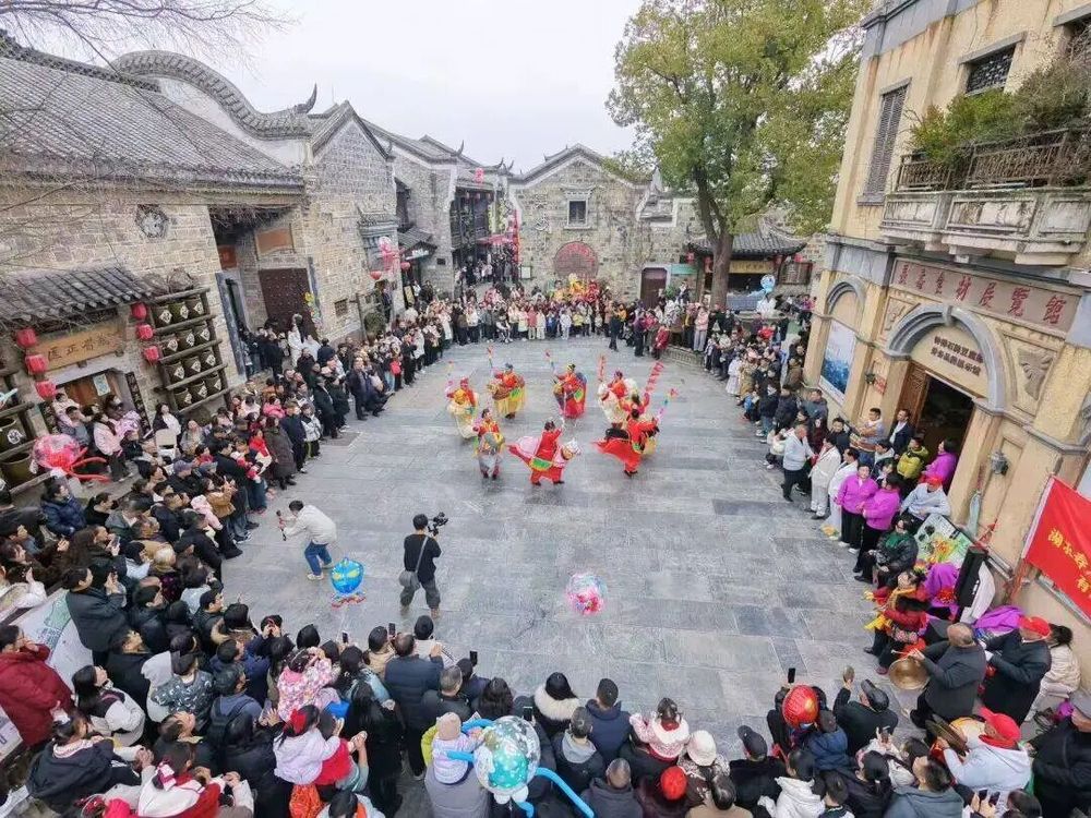 荊門明顯陵文化旅游景區(qū)。莫愁村洋溢著濃厚的節(jié)日氛圍,非遺民俗表演吸引眾多游客圍觀。