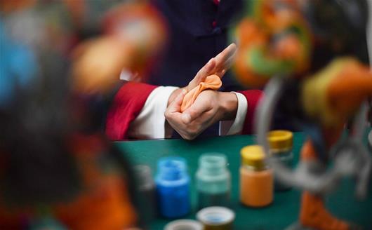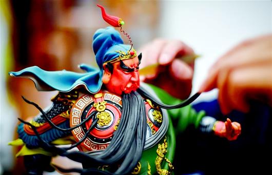 創(chuàng)作之前,他會(huì)換上工作服,沏上一壺茶,這是屬于藝術(shù)家的儀式感。只見他在桌子前坐下,端詳著一尊制作了一半的關(guān)公像,然后,輕輕拿起一團(tuán)經(jīng)過(guò)處理的面團(tuán),選擇兩種顏色,經(jīng)過(guò)揉、捏、搟、壓,再細(xì)細(xì)量裁之后,粘接在關(guān)公的肩頭。接著,裹、卷、捏、壓一番,一塊隨風(fēng)飛揚(yáng)的披巾就這樣活靈活現(xiàn)地成型了。